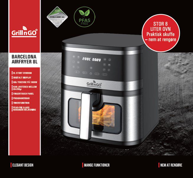Grill’n’go Barcelone Airfryer er designet til at imødekomme dine behov for sund og bekvem madlavning derhjemme, og er det perfekte valg for dem, der ønsker at opnå sprøde og velsmagende måltider uden brug af ekstra olie.
